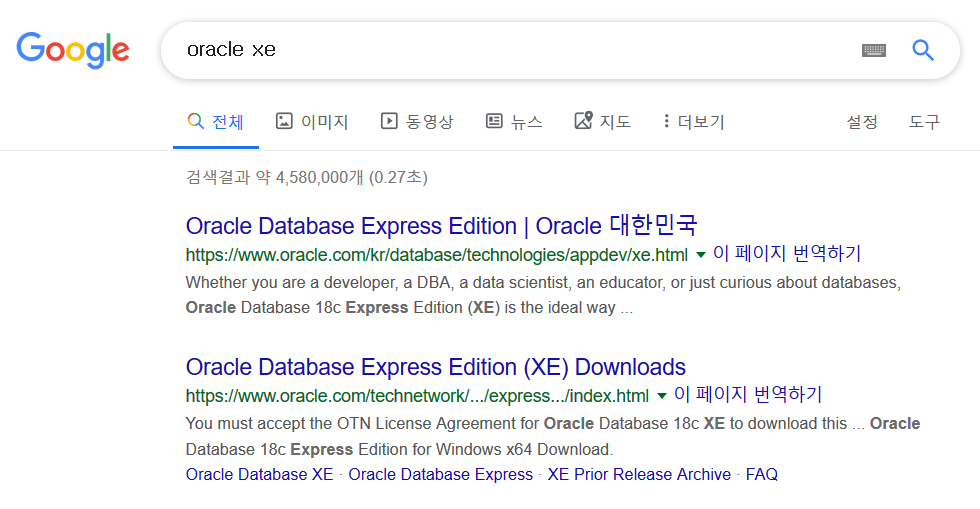구글링해서 oracel xe 검색.