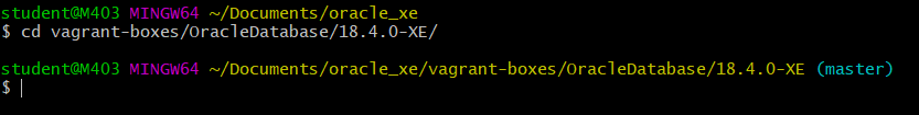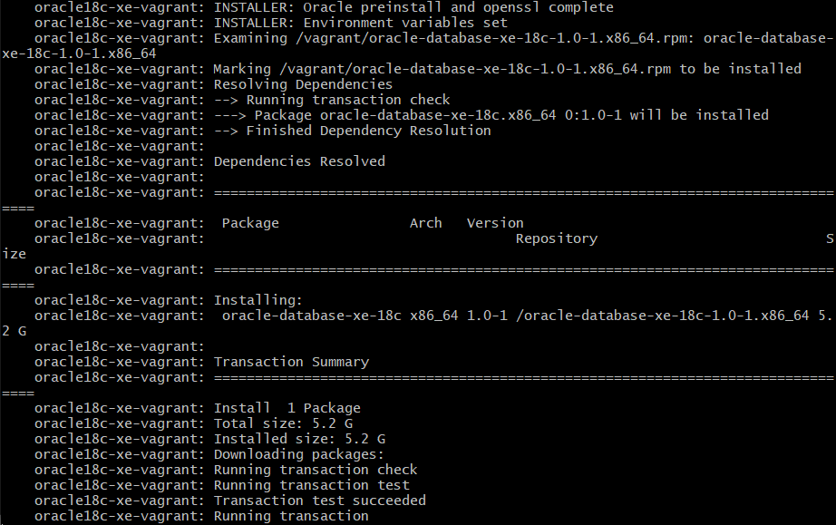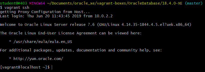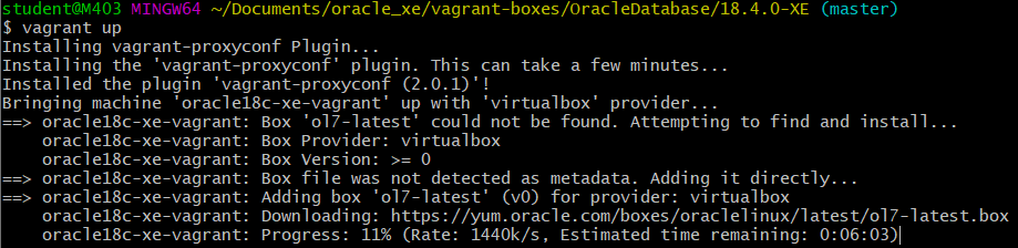 | $ vagrant up getting Proxy Configuration from Host... Bringing machine 'oracle18c-xe-vagrant' up with 'virtualbox' provider... ==> oracle18c-xe-vagrant: Clearing any previously set forwarded ports... ==> oracle18c-xe-vagrant: Clearing any previously set network interfaces... ==> oracle18c-xe-vagrant: Preparing network interfaces based on configuration... oracle18c-xe-vagrant: Adapter 1: nat ==> oracle18c-xe-vagrant: Forwarding ports... oracle18c-xe-vagrant: 1521 (guest) => 1521 (host) (adapter 1) oracle18c-xe-vagrant: 5500 (guest) => 5500 (host) (adapter 1) oracle18c-xe-vagrant: 22 (guest) => 2222 (host) (adapter 1) ==> oracle18c-xe-vagrant: Running 'pre-boot' VM customizations... ==> oracle18c-xe-vagrant: Booting VM... ==> oracle18c-xe-vagrant: Waiting for machine to boot. This may take a few minutes... oracle18c-xe-vagrant: SSH address: 127.0.0.1:2222 oracle18c-xe-vagrant: SSH username: vagrant oracle18c-xe-vagrant: SSH auth method: private key ==> oracle18c-xe-vagrant: Machine booted and ready! ==> oracle18c-xe-vagrant: Checking for guest additions in VM... ==> oracle18c-xe-vagrant: Setting hostname... ==> oracle18c-xe-vagrant: Configuring proxy environment variables... ==> oracle18c-xe-vagrant: Configuring proxy for Yum... ==> oracle18c-xe-vagrant: Mounting shared folders... oracle18c-xe-vagrant: /vagrant => C:/Users/student/Documents/oracle_xe/vagrant-boxes/OracleDatabase/18.4.0-XE ==> oracle18c-xe-vagrant: Machine already provisioned. Run `vagrant provision` or use the `--provision` ==> oracle18c-xe-vagrant: flag to force provisioning. Provisioners marked to run always will still run. |