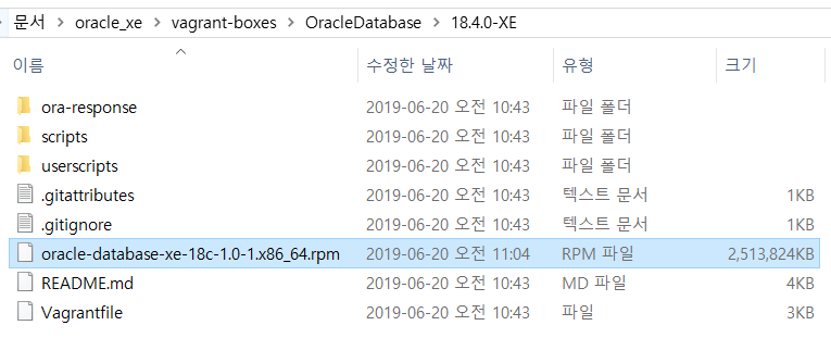 oracle xe 를 다운받아 해당 폴더에 넣어놓는다. 현재 작업을 윈도우10 에서 설치하고 있긴하지만,
