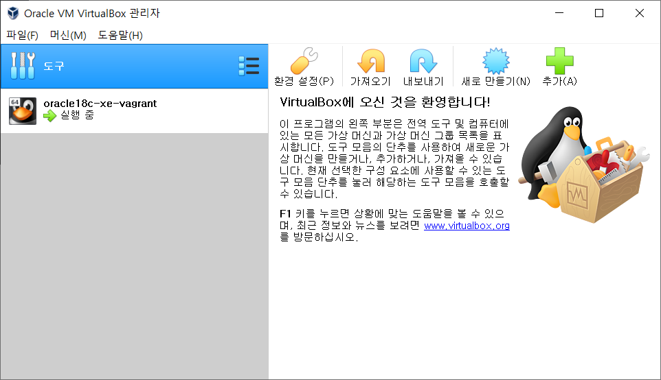 시작-프로그램에서 oracle virtualbox 를 실행한다.