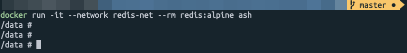 바로 redis-cli 를 run 하는 게 아니라, redis:alpine 이미지를 ash 쉘로 실행하여 접속한다. 물론 redis-net 을 지정해야 한다.