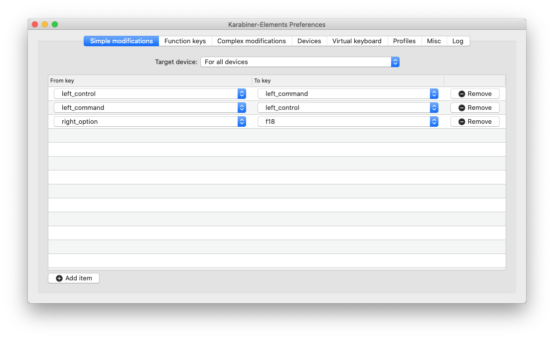 환경설정에서 어느정도 조정하더라도, 결국은 키보드의 기능키들을 소프트웨어로 조정해줘야 하는데, Karabiner-Elements 앱이 그 기능을 제공한다. 무료 소프트웨어이다.