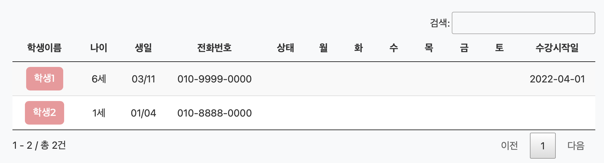 이제 jquery 로 datatables 객체를 정의하면 된다. responsive 는 반응형웹을 위한 옵션이고, true 로 하고나면 넓이의 변화에 따라 보여줄 수 있는 컬럼 갯수가 자동 조절된다. lengthChange 가 true 면 페이지당 row 수를 조절할 수 있는 콤보박스가 보이는데, 여기서는 불필요해서 false 로 가렸다. ordering 가 true면 컬럼별로 화살표가 생기는데 올림,내림차순으로 정렬할 수 있게 된다. 근데 디자인상 별로라서 false 로 여기서는 없앴다. 마지막으로 language 는 언어를 지정할 수가 있는데, 한글로 지정하면 된다. 해당 json 은 https://datatables.net/plug-ins/i18n/ 에서 다운받고, 일부 바꾸고 싶은 단어는 직접 바꿔서 쓰면 된다.