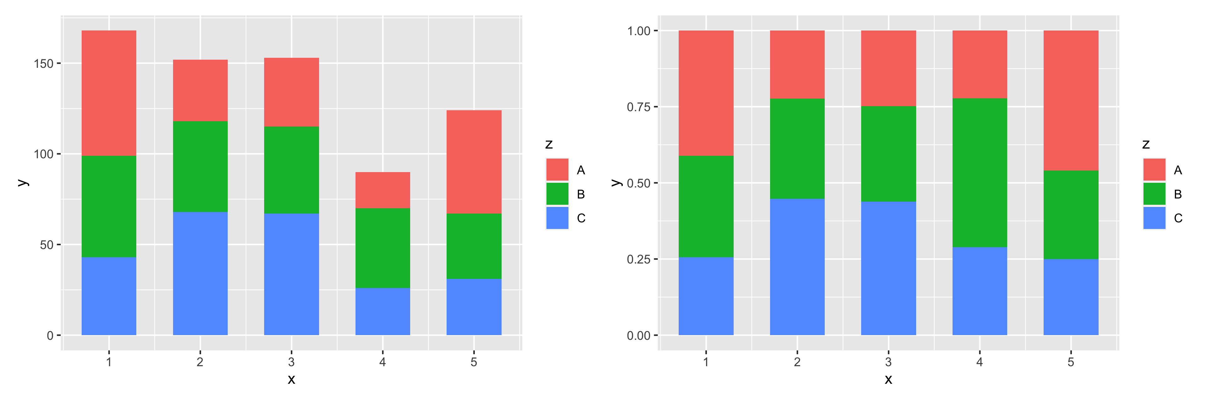 데이터를 만드는 것에 비해, 분할막대그래프를 그리는건 간단하다. 직접 백분율을 구하기 위해 더해서 나누는 작업 없이 그냥 "fill" 이란 옵션만 정의하면된다.