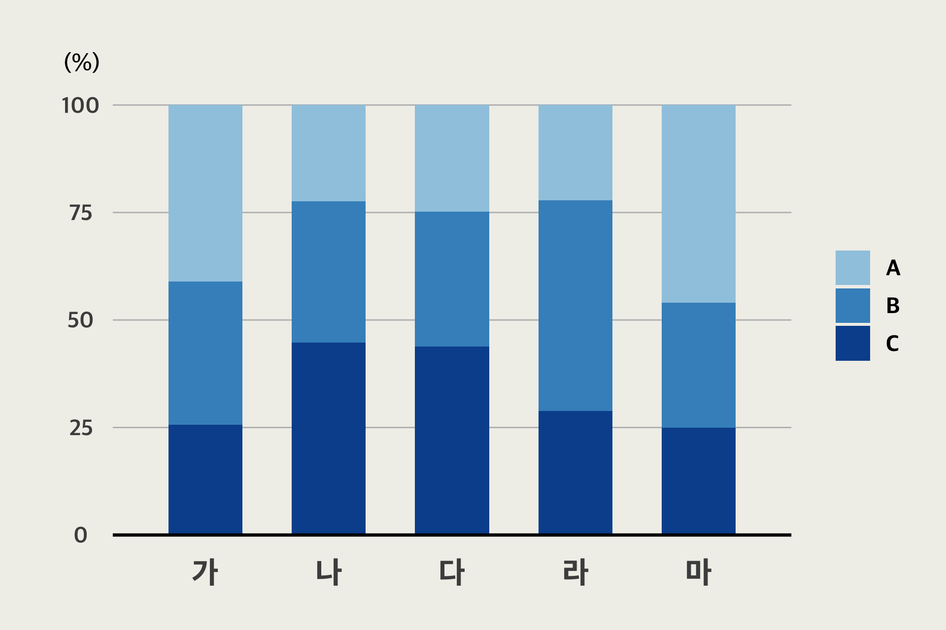 그래프를 만들기위해 데이터를 만들어야 한다. 비례 막대차트를 만들어야 하니, 5개의 막대안에, 각각 A,B,C 3개의 종류의 데이터를 만들어본다.