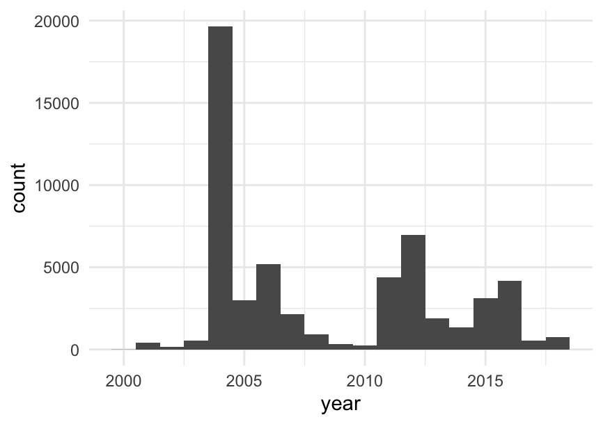 geom_histogram(aes(year), binwidth = 1, show.legend = F) +