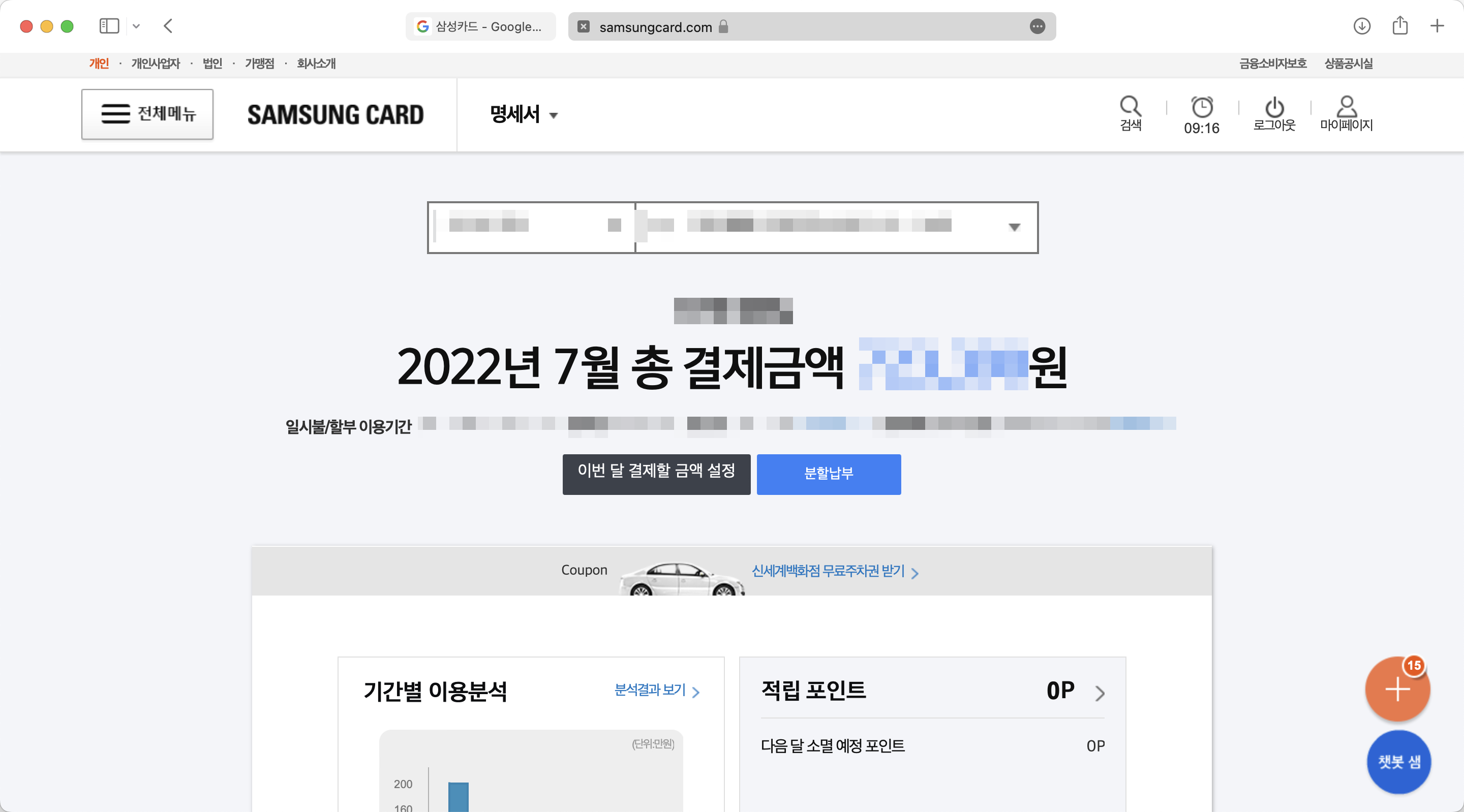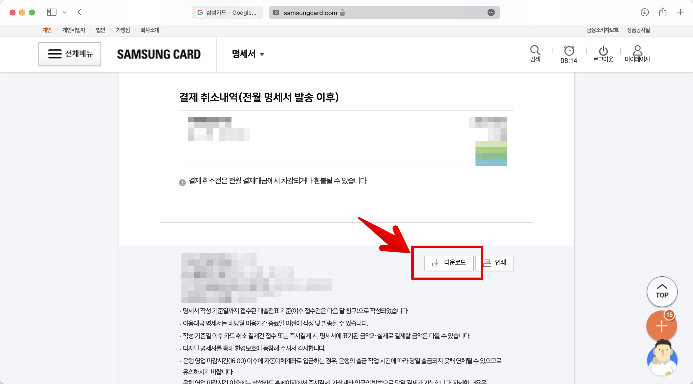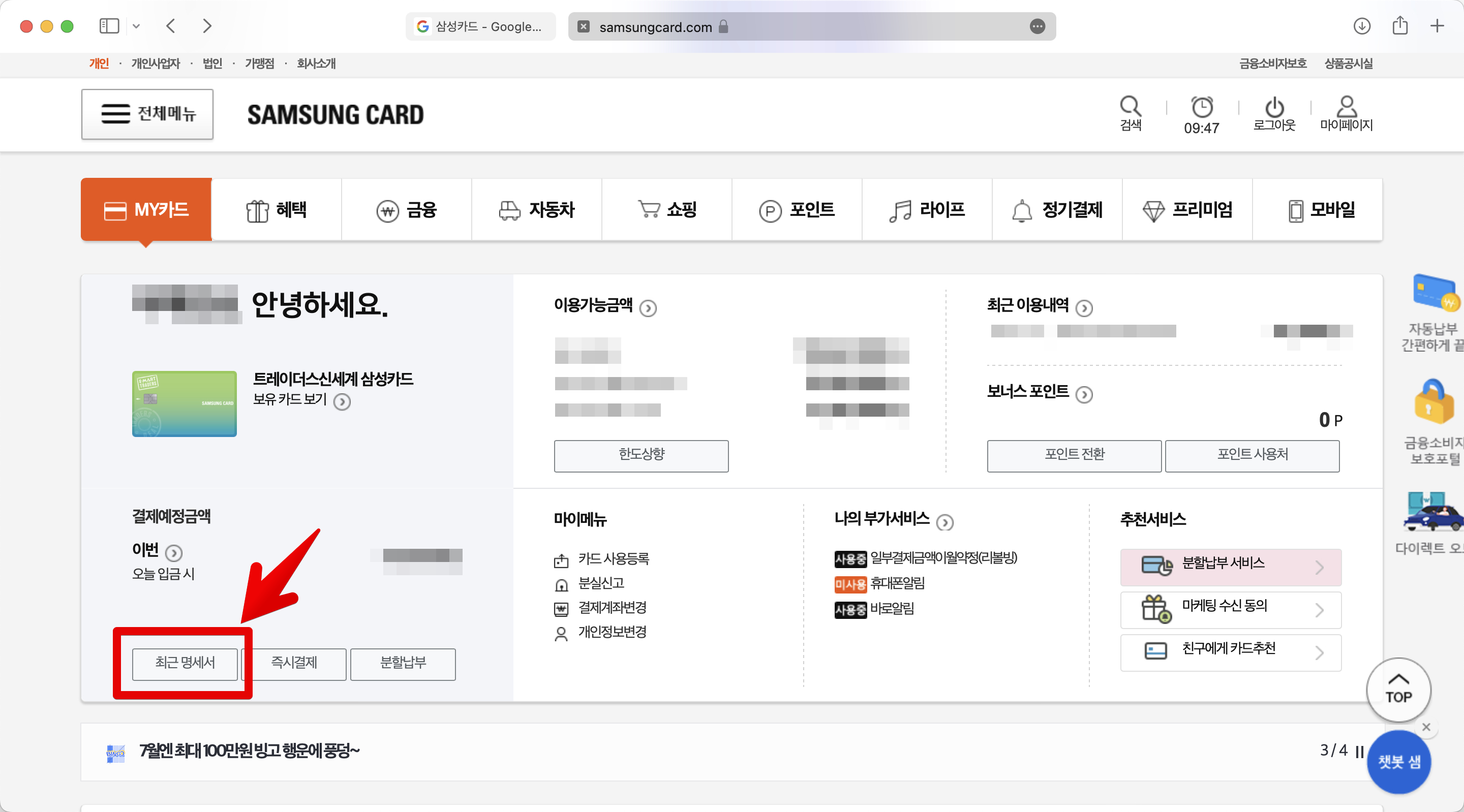 로그인 하고나면 메인화면에 my 카드 정보를 볼 수 있는 영역이 있고, 그곳에서 "최근 명세서"를 클릭한다.