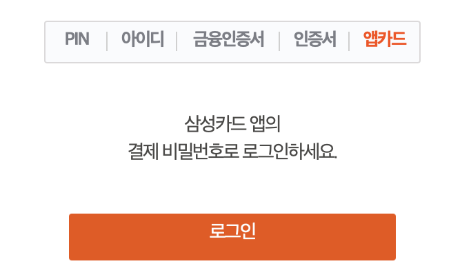 앱카드 인증방식은 아래 순서대로 하면 된다. 삼성앱카드를 실행하고 pc결제를 선택한 후에, QR코드를 스캔하기만 하면 로그인이 된다.