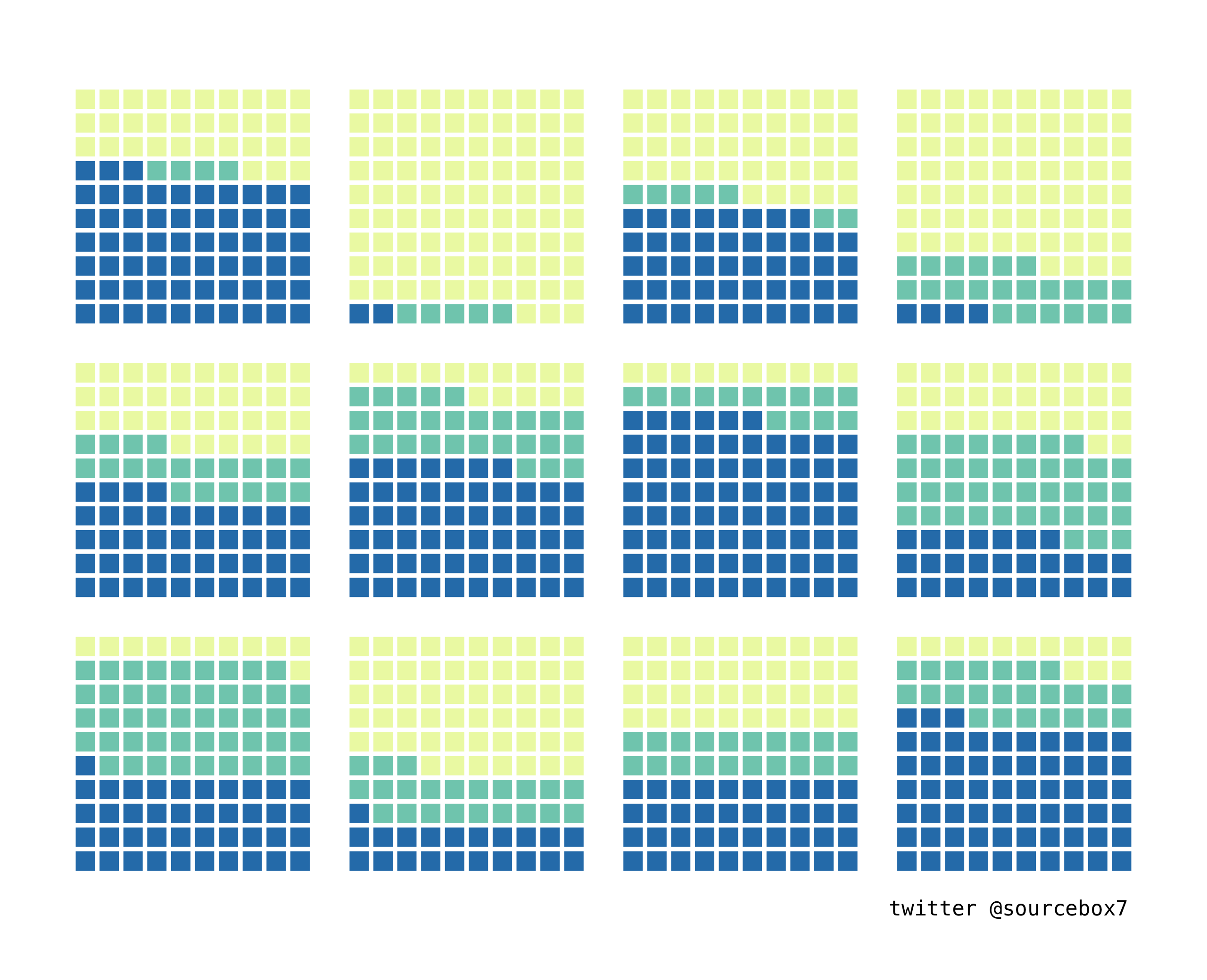 데이터를 만들기에 따라 아래와 같이 결과물을 만들수도 있다. 10x10 데이터를 12개 세트를 준비하는 과정이 좀 힘들고, 그걸 결국 그래프로 그리기위한 코드는 맨아래에 보듯이 몇 줄되지 않는다. 그래도 격자무늬 그리면서 어려웠던건, 정사각형 비율대로 하면서 x/y 축을 바꾸는 방법을 알아내는 거였다. 원래는 aspect.ratio = 1 가 아니라, coord_fix() 함수로 사용했었다. 근데 coord_fix와 coord_flip 을 동시에 사용할 수 없어서 열심히 구글링을 한 결과.. aspect.ratio = 1 옵션을 사용하여 완성하게 되었다.