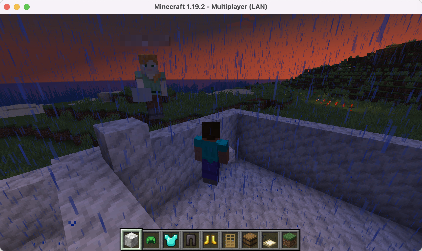 드디어 만났다! ㅎㅎ 집 와이파이로 멀티플레이 성공! 다만 처음에 로그인하면 전혀 다른곳에서 생성되기 때문에, 찾아가려면 좌표를 확인하고 잘 날아가야 한다. 그래서 크리에이티브로 시작하는게 좋다.