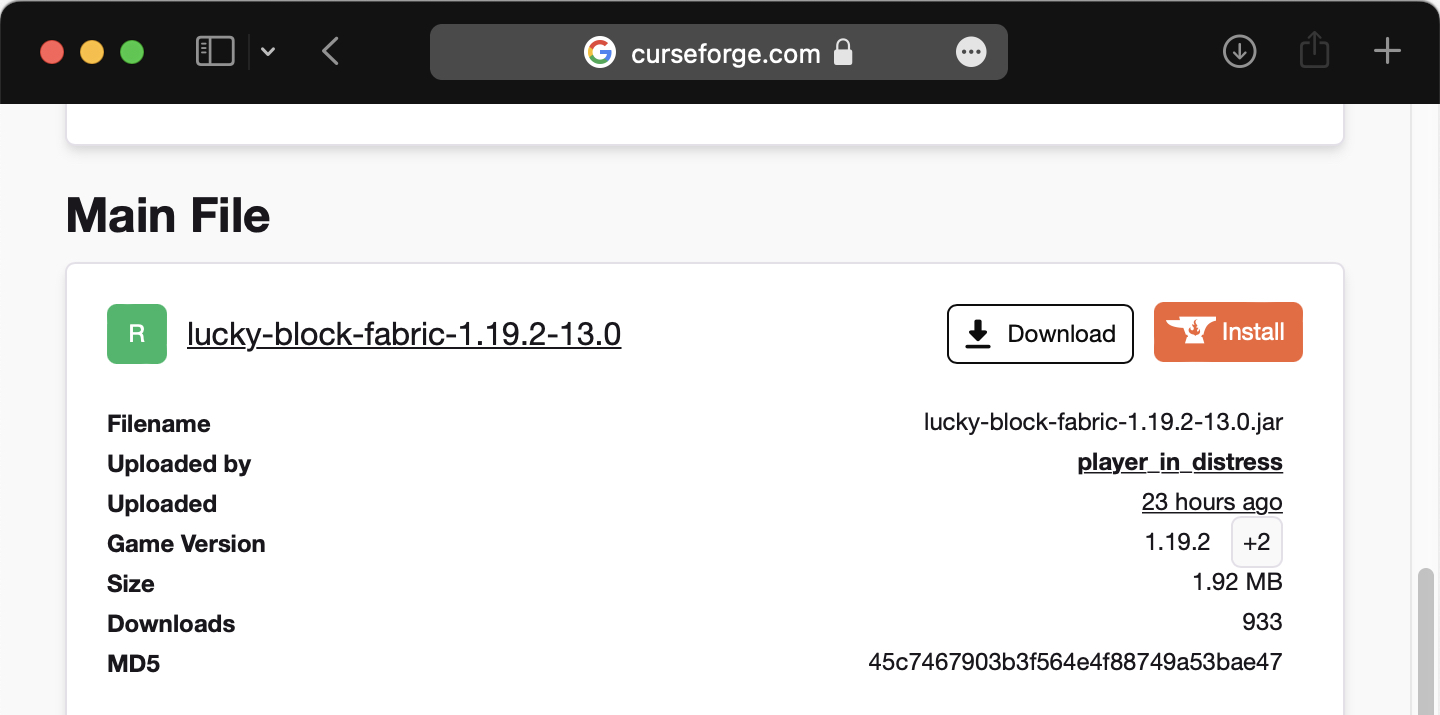 럭키블럭 레이스 맵을 실행하려면, 럭키블럭 모드파일을 받아 mods 폴더에 넣어놔야 한다. 나는 fabric 기반으로 실행예정이기 때문에 패브릭(fabric) 버전으로 받았다. https://www.curseforge.com/minecraft/mc-mods/lucky-block/files 클릭해서 이동한다.
