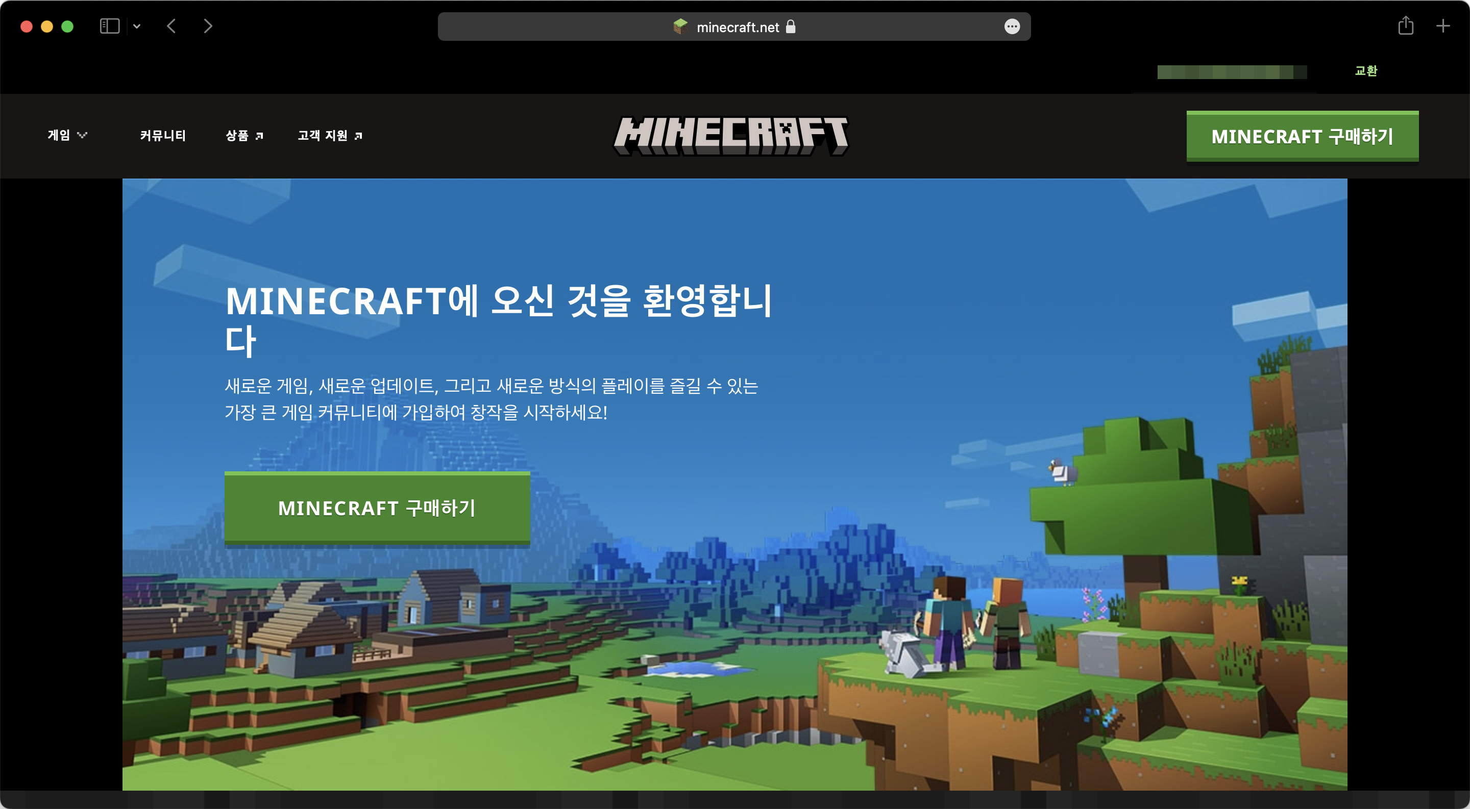 그러면 pc에서 어떤 버전으로 구매를 해야 하는가? 결론은, 고민할 필요가 없다. 자바에디션과 베드락 에디션을 묶어서 팔고 있기 때문이다. 3만원으로 2개 버전을 pc 에서 게임할 수 있다. 이제 구매를 진행해보자. 홈페이지에 가서 [minecraft 구매하기] 버튼을 클릭한다.