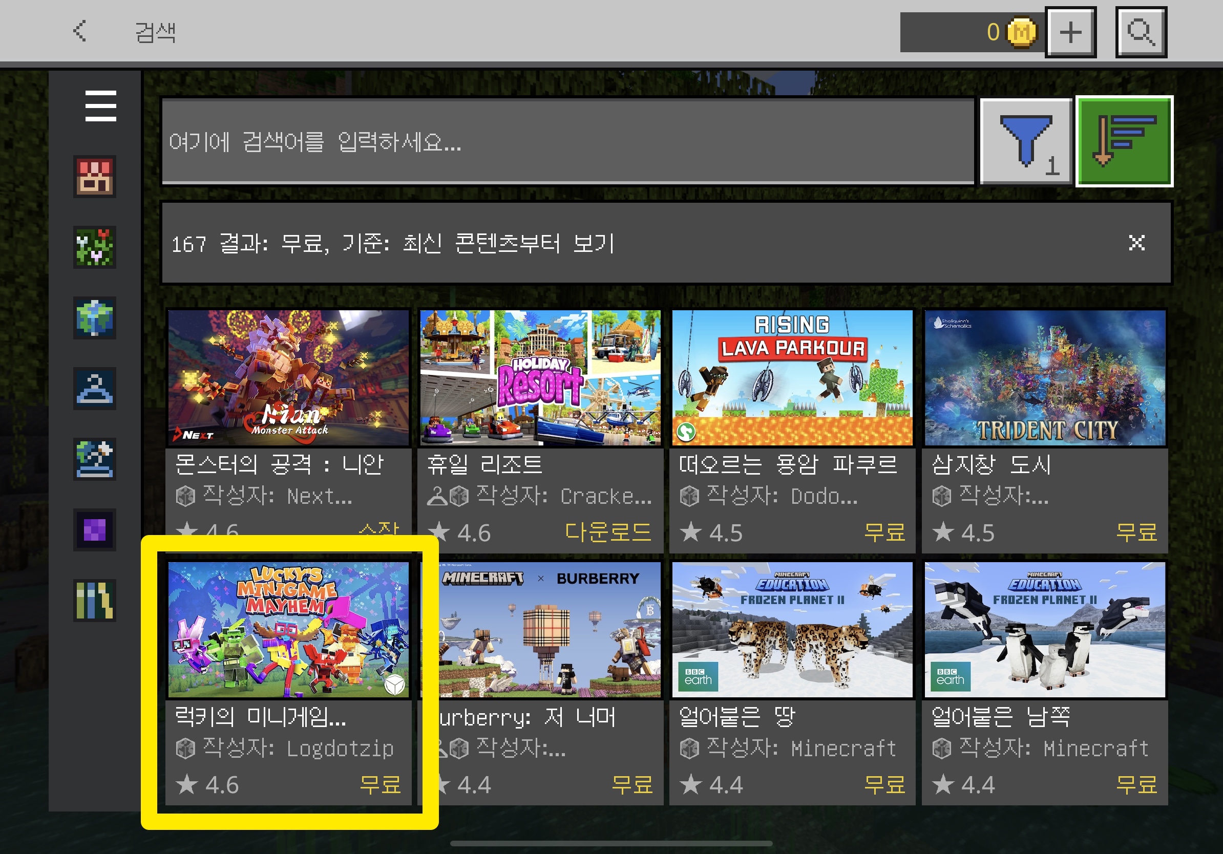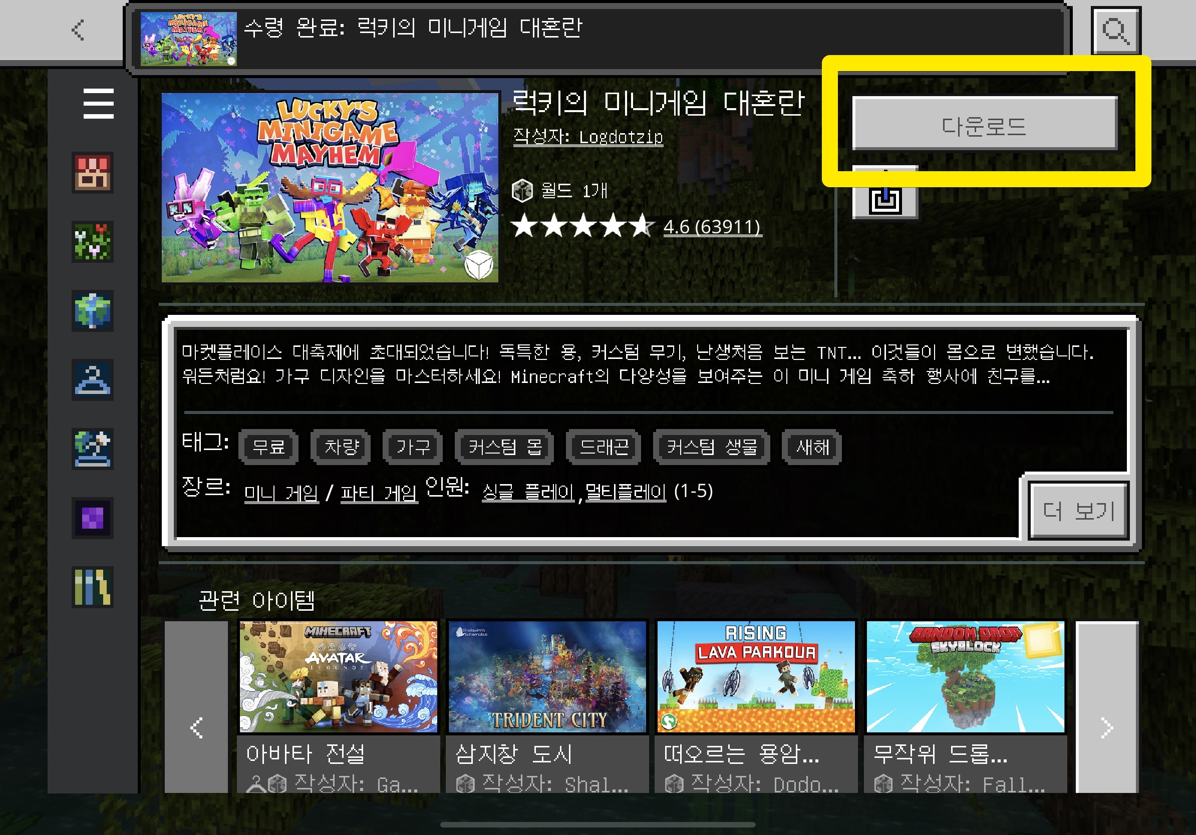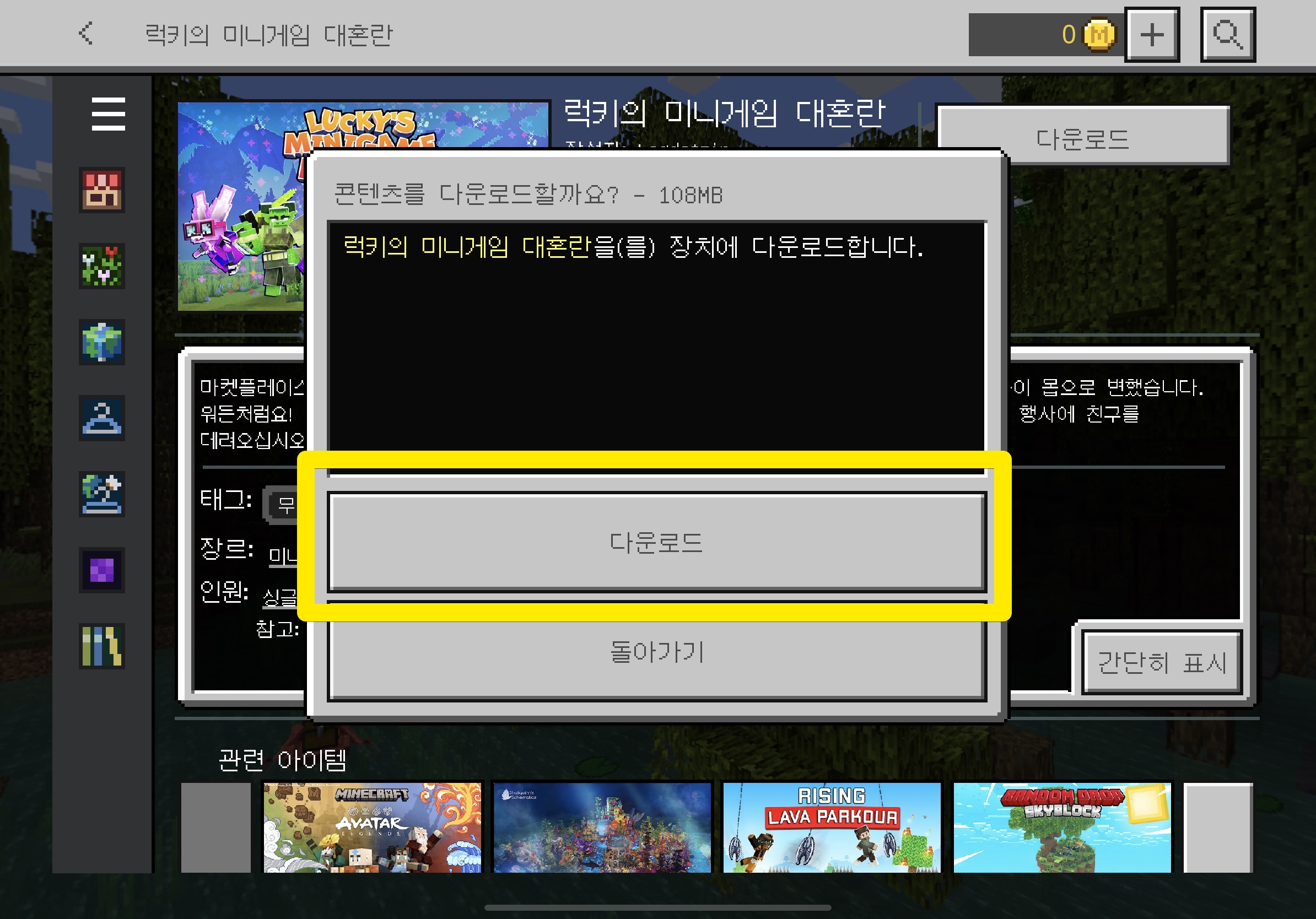 무료 컨텐츠들이 꽤나 있는 걸 볼 수 있다. 그중에 하나 다운로드 받아 실행까지 해보려 한다. [럭키의 미니게임]을 선택했다.