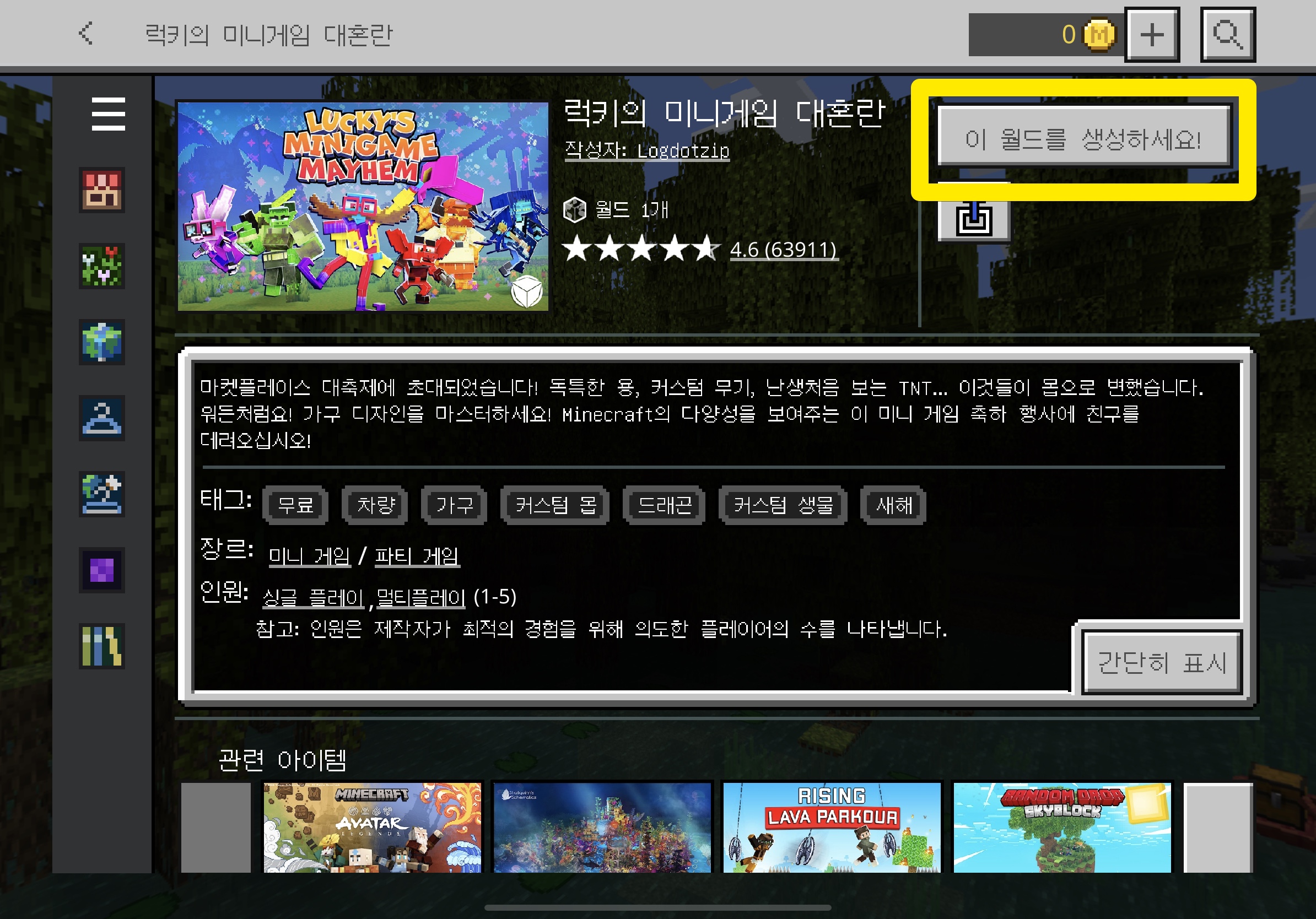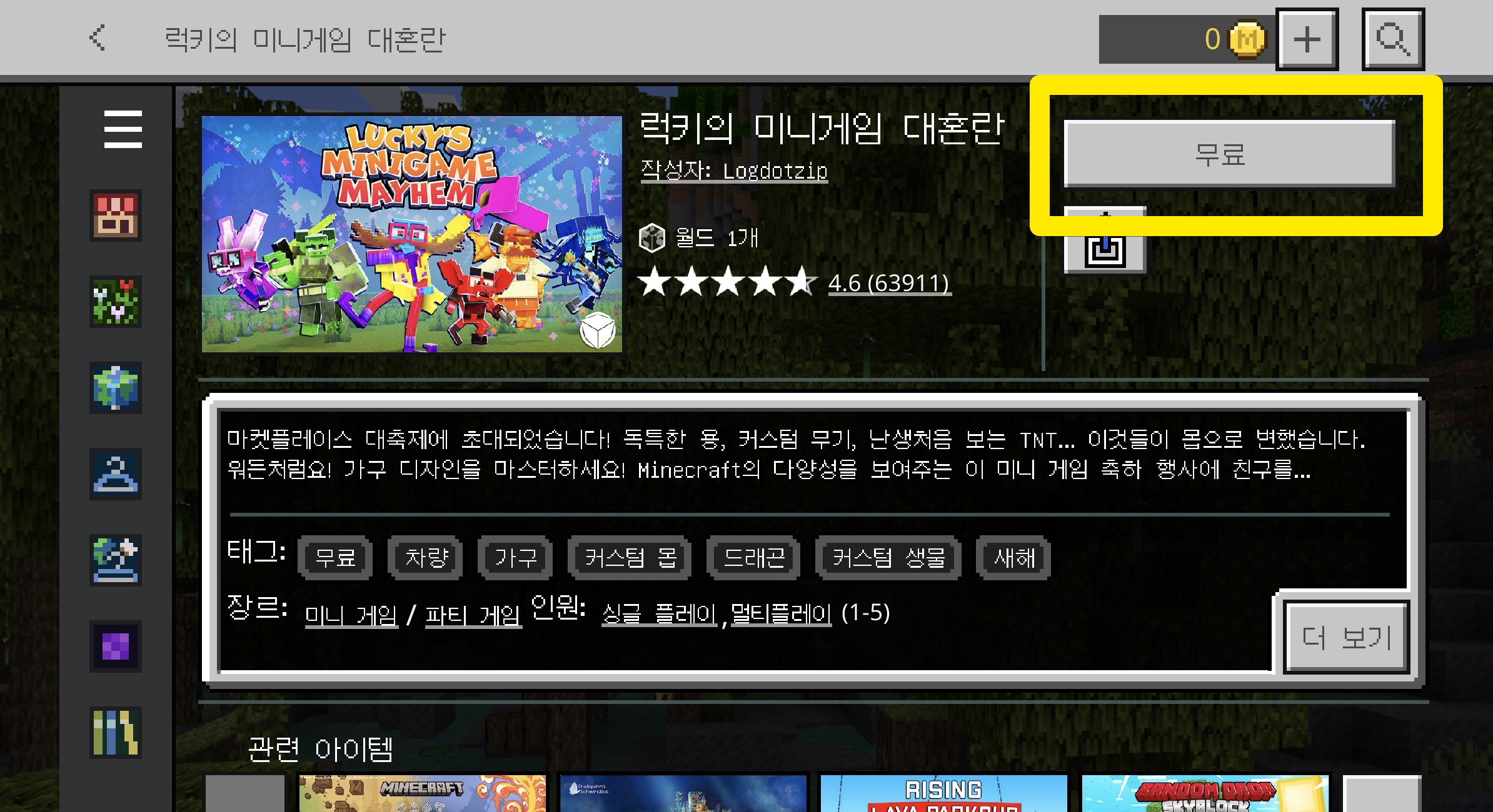럭키의 미니게임 대혼란 이라는 맵인데, [무료] 이부분을 클릭한다.