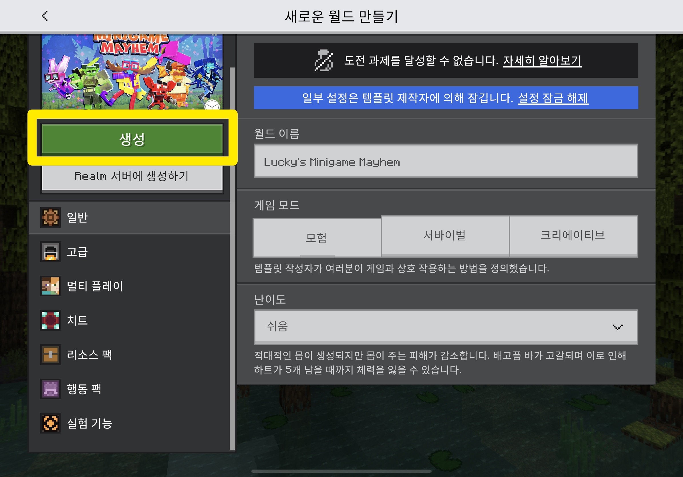 보통은 게임 모드가 다 열려있는데, 일부 맵은 제작자에 의해 잠기는 케이스도 있나보다. "생성" 버튼을 클릭한다.