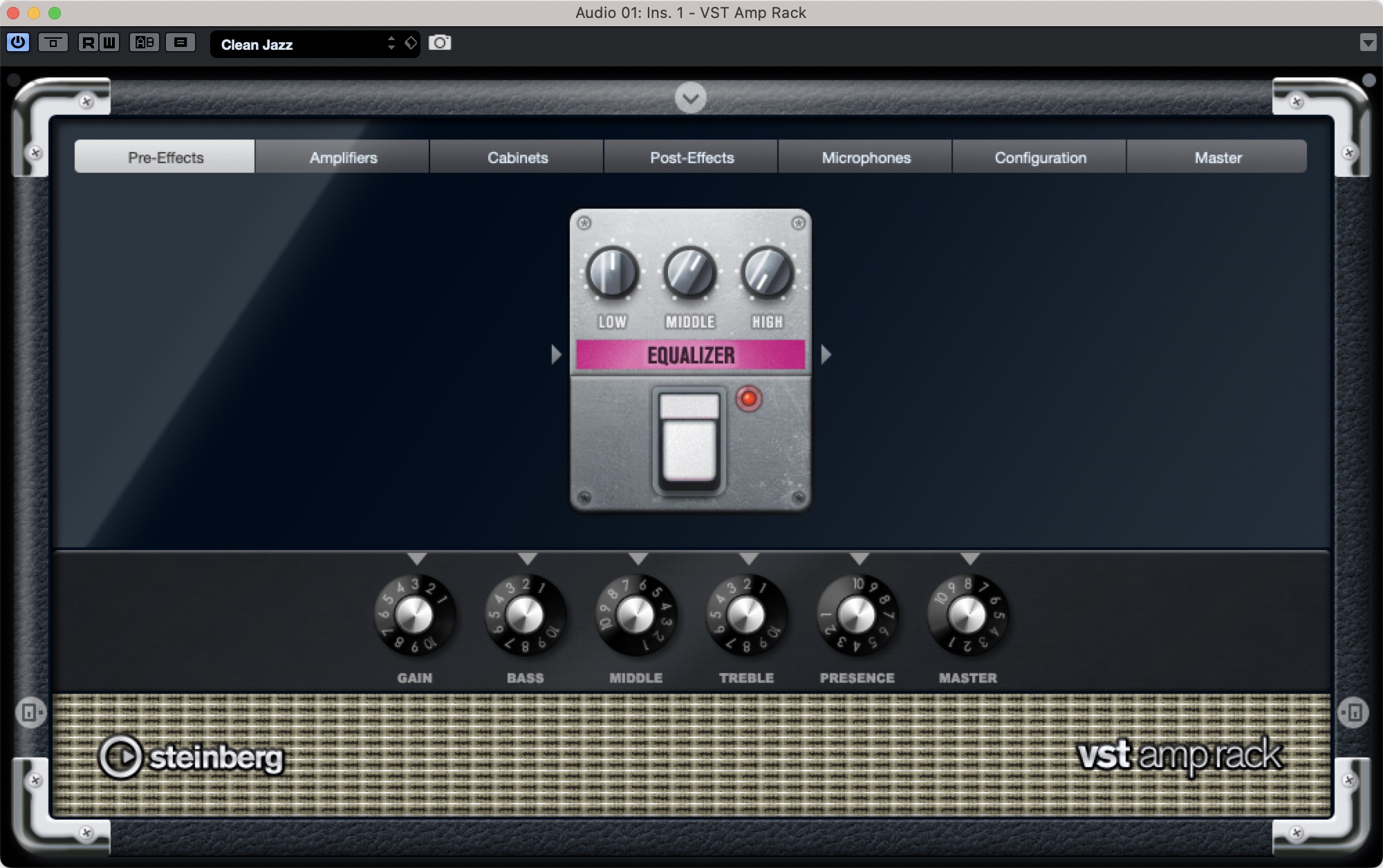 여기서도 정말 많은 옵션이 있어서 비싼 상용 VST 를 살필요없다. 큐베이스에서 기본 제공하는 VST Amp Rack 을 셋팅해가며 기타톤을 만들어보자.