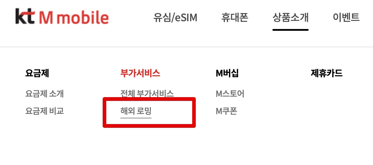KT M 모바일 웹사이트에서 해외 로밍 메뉴를 찾아들어가 봤어요. 여러 부가서비스 중에서 '해외 로밍'을 선택하면 바로 다양한 로밍 상품들을 확인할 수 있었죠. 다양한 옵션 중에서 제일 적합한 상품을 고르기 쉽게 되어 있어서 좋았어요.