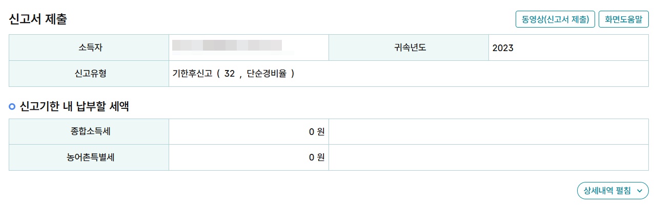 25년 2월에 23년 귀속 종합소득세를 신고하는 무례를 범했지만, 다행히 번게 별로 없어서 세금이 0원으로 나왔다. 그리고 기한후 신고를 하면 가산세도 나와야 하지만, 종합소득세가 0원이라 가산세도 없었다. 하지만 이런 해피엔딩은 별로 없을테니, 꼭 기한을 지켜서 불이익을 당하지 않도록 하자.