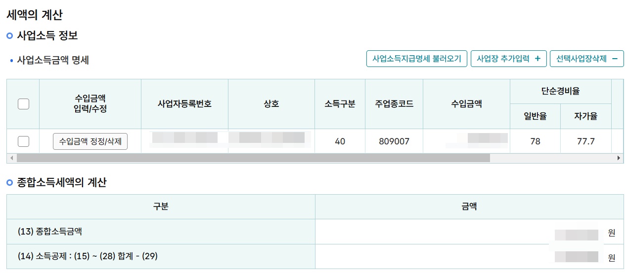 수입금액은 자동으로 계산되져 나온다. 아마도 매년2월에 하는 사업장현황신고 정보를 가져오는 듯 하다. ✅ 만약 수입금액이 1000만원이라고 하고 자가율 단순경비율을 적용한다면, 경비 777만원을 제외한 223만원이 종합소득금액이 된다.