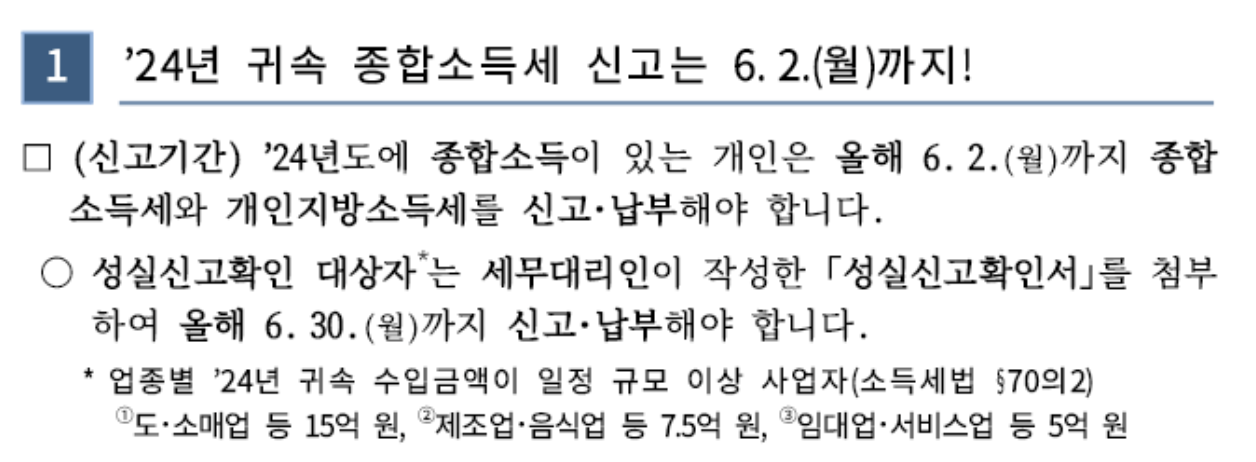 2025년 5월이 되면서 또 한 번 종합소득세 신고 시즌이 돌아왔다. 2024년 귀속 수입금액에 대해 종합소득세 신고 및 지방소득세 납부를 6월 2일(월)까지 마쳐야 한다. 성실신고확인 대상자는 일정 규모 이상의 사업자를 의미하며, 나랑과는 상관이 없었다. ㅎㅎ